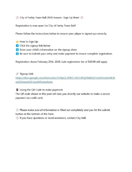 Note: Pages will open in a new browser window. External pages are not endorsed by City of Farley.